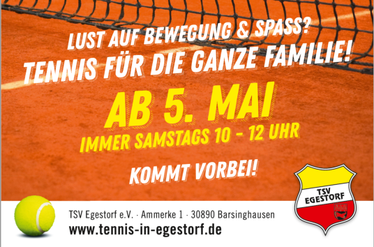 Vom 05.05. bis zum 23.06. bieten wir Interessierten jeden Samstag von 10:00 Uhr - 12:00 Uhr ein kostenloses Schnuppertraining mit Trainer an. Alle Familien, Erwachsene, Jugendliche und Kinder sind herzlich eingeladen, daran teilzunehmen. Die Mitgliedschaft im TSV Egestorf ist dabei keine Voraussetzung. Jeder, der Lust auf Tennis hat, kann teilnehmen, wobei auf einem Platz Kinder kleine Spielchen mit dem gelben Filzball ausprobieren können und auf einem anderen Platz Erwachsene und Jugendliche sich mit dem Tennisschläger vertraut machen. Dabei spielt es keine Rolle, ob ihr schon Erfahrungen mit dem Tennisspielen habt oder einfach ganz neu starten möchtet. Auch das Alter ist völlig unwichtig. Also, einfach mal ausprobieren, mitmachen und Spaß haben! Am Besten, ihr kommt gleich zum ersten Training am 05.05. und dann regelmäßig jeden Samstag. So könnt ihr diese Aktion optimal nutzen. Der Einstieg an einem späteren Samstag ist natürlich genausogut möglich. Wir freuen uns auf euch und würden euch gerne auf unserer gemütlichen Holzterrasse vor der Tennishütte begrüßen.